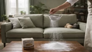 Sprinkle a thin, even layer of baking soda across the entire sofa, including cushions and gaps.