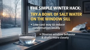 The idea sounds almost too basic: place a bowl of salt water on the coldest window sill and leave it there. The setup is straightforward. Warm water goes into a ceramic or glass bowl, a few spoonfuls of salt are added, and the mixture is set close to the glass.